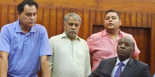 Lawyer Cliff Ombeta (right) with his clients Vijaygiri Anandgiri Goswami, Gulam Hussein and Ibrahim Akasha during the mention of their extradition proceedings at the Mombasa Law Courts back in January 13, 2017.