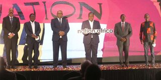 Nairobi Metropolitan Services Director-General Mohammed Badi, Nation Media Group Editorial Director Mutuma Mathiu, NMG CEO Stephen Gitagama, Interior Cabinet Secretary Fred Matiang'i, NMG Chairman Wilfred Kiboro and ICT CS Joe Mucheru during the launch of Nation.Africa at Serena Hotel in Nairobi on September 4, 2020.
