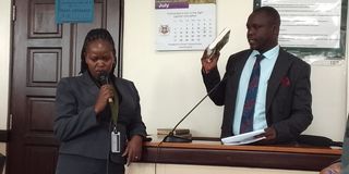 Chief Inspector Kiptoo Kisorio sworn at the Anti-corruption Court Milimani, in the Sh20m graft case against Mike Sonko.