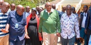 Former President Uhuru Kenyatta (centre) with former Interior Cabinet Secretary Fred Matiang'i (right) and Jeremiah Kioni during a Jubilee Party meeting in Murang’a County on November 7, 2025.