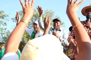 DAP-K deputy party leader George Natembeya, who is also Trans-Nzoia governor (m), and Kakamega Senator Boni Khalwale of UDA (rt) address voters of Malava Constituency in Kakamega on October 29, 2025, during the campaign for parliamentary candidate Seth Panyako (in blue shirt) ahead of the October 27 by-elections.
