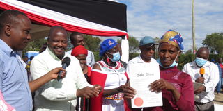 Health Cabinet Secretary Mutahi Kagwe issues title deeds to residents of Lekiji village in Laikipia North on July 14, 2022.