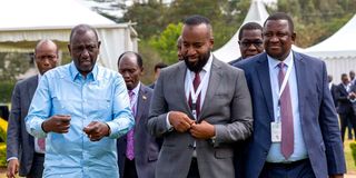 President William Ruto with CS Hassan Joho and Salim Mvurya during the Third National Executive Retreat at KCB Leadership Centre in Kajiado County.