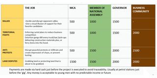 For instance, disrupting peaceful protests, infiltrating demos to create an impression of chaos, or posing in front of businesses to prevent looting fetches Sh500 from an MCA, Sh1,500 from an MP, Sh2,000 from a governor and Sh2,500 from businesspeople.