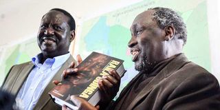 ODM chief Raila Odinga (left) hands his biography to writer Ngugi wa Thiong’o at his offices in Nairobi on June 2, 2015.