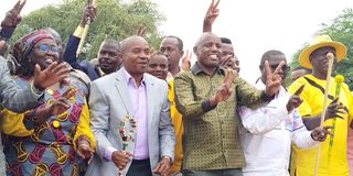 Deputy President Kithure Kindiki( second left) having a jig with local leaders at Marigat, Baringo South, on August 16, 2025, where he presided over a women economic empowerment.