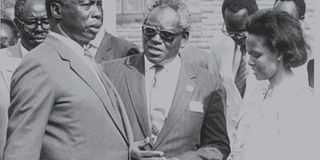 From left, former President Daniel Moi and his vice-president Dr Josephat Karanja with his wife at the Jomo Kenyatta International Airport when seeing off visiting Head of States in 1988 following the Independence anniversary celebrations. PHOTO | FILE | NATION MEDIA GROUP