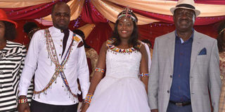 ODM leader Raila Odinga (right) poses for a photograph with newly-wedded Emurua Dikirr MP Johana Ngeno and his Wife Nayianoi Ntutu on August 18, 2018 at the Emurua Dikirr Secondary School. PHOTO | GEORGE SAYAGIE | NATION MEDIA GROUP