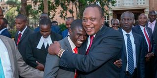 Deputy President William Ruto with Igembe South MP John Paul Mwirigi during the Jubilee parliamentary group meeting at State House, on August 30, 2017. PHOTO | PSCU