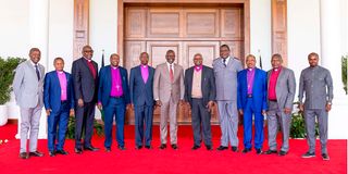 President William Ruto during a meeting with religious leaders from Machakos, Makueni and Kitui counties led by Archbishop Timothy Ndambuki (left) of the Africa Brotherhood Church after a meeting at State House, Nairobi.