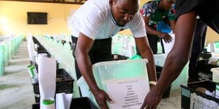 IEBC officials label containers holding election materials at St Bhakita Siakago Girls High School in Embu County on November 25, 2025, ahead of their deployment for Thursday’s Mbeere North parliamentary by-election.