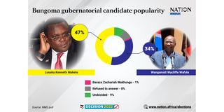 In Bungoma County, the outgoing Speaker of the National Senate Kenneth Lusaka (Ford-K) looks well poised to recapture the gubernatorial seat he held between 2013 and 2017. Running on the Ford Kenya ticket, he polls 47 per cent against incumbent Wycliffe Wangamati’s 34 per cent.