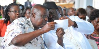 Leaders Oburu Oginga and Raila Odinga during the Jaramogi Oginga Odinga Silver Jubilee Anniversary service at the St. Stephens ACK Cathedral in Kisumu on February 17, 2019.