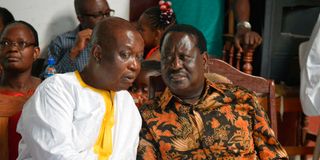 Leaders Oburu Oginga and Raila Odinga during a Christmas service at St Peter ACK Church in Bondo on December 25, 2018.