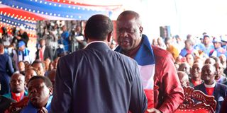 Former Interior Cabinet Secretary Fred Matiang'i and Wiper Patriotic Front leader Kalonzo Musyoka during the Wiper Patriotic Front national delegates’ convention at Uhuru Park in Nairobi on October 10, 2025.