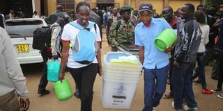 Polling clerks and a security officer during distribution of materials at Uasin Gishu County Hall on August 7, 2017. PHOTO | JARED NYATAYA | NATION MEDIA GROUP
