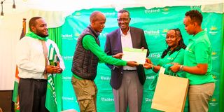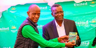 United Green Movement co-party leader Neto Agostinho (left) presents the party flag to former Chief Justice David Maraga during the launch of his 2027 presidential bid at the party’s head office in Nairobi.