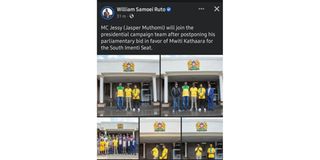 Comedian MC Jessy (real name Jasper Muthomi) has dropped his bid for the South Imenti parliamentary seat, Deputy President William Ruto has announced.