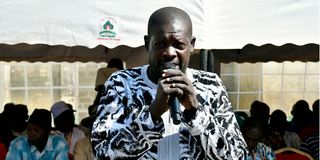 Luo Council of Elders, Nairobi Branch Chairman Tom Odongo makes his remarks during a public baraza held at Makongeni Social Hall on March 01, 2025.