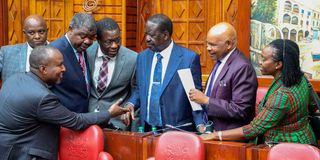 Azimio leaders Raila Odinga (centre), Martha Karua, Opiyo Wandayi, Junet Mohammed TJ Kajwang and Makau Mutua consult with MPs at County Hall Nairobi on November 24, 2022, after the hearing of a petition to remove four IEBC commissioners.