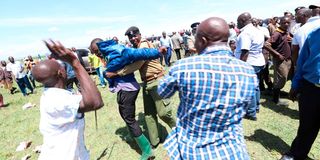 A police officer protects a resident from the public when mayhem ensued during a function attended by ODM Leader Raila Odinga at Kang’o, Ombeyi in Muhoroni Constituency on May 13, 2019.