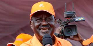 ODM party leader Raila Odinga addresses leaders and his supporters during the party's 20th anniversary celebrations at Bukiri Primary School in Busia County on February 28, 2025.