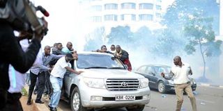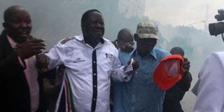 Cord leader Raila Odinga is assisted by his guards after police lobbed tear-gas canisters at protesters outside IEBC offices at Anniversary Towers in Nairobi on April 25,2016. FILE PHOTO | EVANS HABIL |