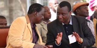 Former Prime Minister Raila Odinga (left) and former Imenti Central MP Gitobu Imanyara at a past event.