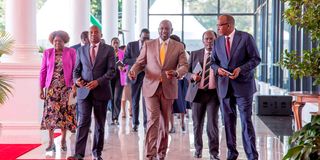 President William Ruto, (centre) Deputy President Prof Kithure Kindiki (left), Health CS Aden Duale (right) and other Cabinet secretaries after a Cabinet meeting at State House, Nairobi, on December 15, 2025.