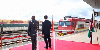 Deputy President Kihure Kindiki (left) and Chinese Vice President Han Zheng during the official flag-off ceremony of the inaugural Zero traffic consignment to China on March 23, 2026 at Nairobi train Terminus.