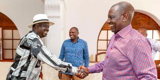 President William Ruto (right) and Former Prime Minister Raila Odinga at State House in Mombasa on February 24, 2025.