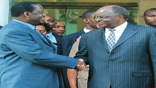 President Kibaki shakes hands with Raila Odinga (right) outside Harambee House in Nairobi in January, 2008.