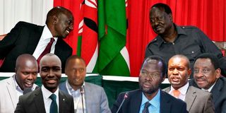 President William Ruto (back left) and Raila Odinga with their allies (from left) Keiyo South MP Gideon Kimaiyo, Bomet Senator Hilary Sigei, Senate Majority Leader Aaron Cheruiyot, Kisumu Governor Anyang' Nyong'o, Nairobi Senator Edwin Sifuna and Siaya Governor James Orengo.