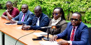 Political activist Silas Jakakimba (far right) briefs the media at Sarova Panafric Hotel on 23 April 2025 in support of President Ruto's economic interventions. He is joined by (from left) former Mombasa County Assembly Speaker Thadius Rajwayi, Keiyo South MP Gideon Kimaiyo, Bomet Senator Wakili Hillary Sigei and Nominated MP Renee Mayaka.