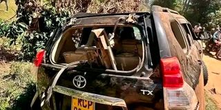 A vehicle that was damaged when goons attacked Governor George Natembeya's convoy in Chwele ward, Kabuchai constituency on November 22, 2025.