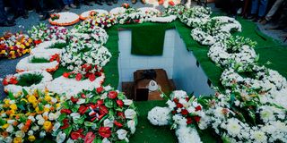 The coffin of Kenya's former Prime Minister Raila Odinga, who died while receiving medical treatment in India, lies in a grave surrounded by floral wreaths during his burial at the Kango Ka Jaramogi home in Bondo, Siaya County, Kenya, October 19, 2025.