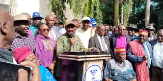 Wiper Democratic Front Party Leader Kalonzo Musyoka addressing a presser in Kisumu on November 6,2025 before leaving for Bondo to pay respects to Raila Odinga.