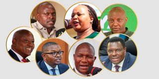 Mt Kenya leaders: Kiharu MP Ndindi Nyoro and governors Anne Waiguru (Kirinyaga), Irungu Kang'ata (Muranga), Kahiga Mutahi (Nyeri), Isaac Mutuma (Nyeri), Kiarie Badilisha (Nyandarua) and Tharaka Nithi's Mūthomi Njūkì.