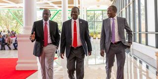 President William Ruto (left), ODM leader Raila Odinga (centre) and Kisii Governor Simba Arati arrive for a Gusii political leadership meeting at State House, Nairobi.