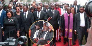 President William Ruto, his Deputy Kithure Kindiki, Speaker of the National Assembly, Moses Wetangula, other leaders arrive at Captain grounds in Ol Kalou during a requiem mass for area MP David Kiaraho on April 8, 2026. (inset) Former DP Rigathi Gachagua and Nyandarua Senator John Methu.
