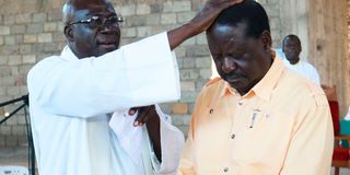 Dean of the A.C.K St. Stephen’s Cathedral Church in Kisumu Venerable Zephaniah Kore Omollo prays for NASA flagbearer Raila Odinga during a church service on May 21, 2017. Raila said he was feeling closer to God after visiting Israel's Wailing Wall where he repented of his sins and prayed for the country. He urged Kenyans not to vote for him or President Uhuru Kenyatta because of their tribes but to consider what they stand for.