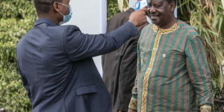 ODM leader Raila Odinga is screened for coronavirus at State House in Nairobi during the national prayers day on March 21, 2020. PHOTO | PSCU