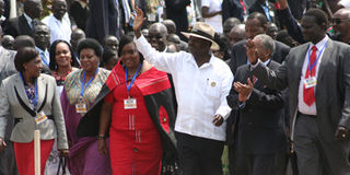 Prime minister Raila Odinga, his wife Ida and Kenyan ministers arrive at the Dr John Garang mausoleum for independence day celebrations on July 9, 2011.