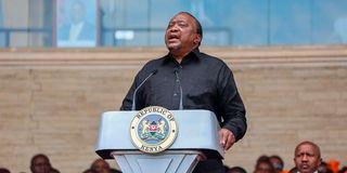 Former President Uhuru Kenyatta speaking during the State funeral of former Prime Minister Raila Odinga at Nyayo National Stadium on October 17, 2025.