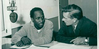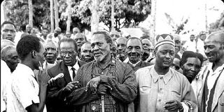 Daily Nation journalist James Ngugi (Ngugi wa Thiong’o) with President Jomo Kenyatta and Vice President Jaramogi Odinga at Ichaweri in Gatundu in 1964.