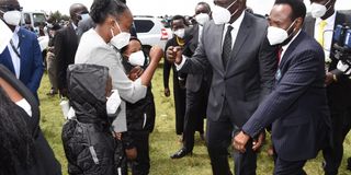 Deputy President William Ruto greets Lucy Ngendo, one of the two widows of the late Peter Chomba, MCA for Huruma Ward, Uasin Gishu County Assembly, during the burial ceremony held at Huruma grounds in Eldoret town on October 21, 2020.
