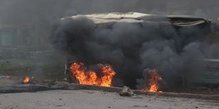 Protesters set a kiosk ablaze in Karatina town, Nyeri County, during the Saba Saba protests on July 7, 2025.