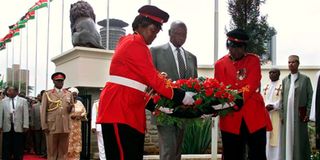 Former President, Daniel arap Moi, lays a wreath of flowers at Mzee Jomo Kenyatta's mausoleum on August 22, 2001 to commemorate the 23rd anniversary of Kenya's first president's death.