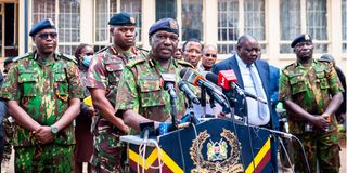 Inspector General of Police Douglas Kanja addresses journalists on June 9, 2025, at Central Police Station, flanked by his deputies Eliud Lagat (left) and Gilbert Masengeli (second left).