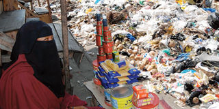 A hawker displays her wares next to a heap of uncollected garbage outside a market in Mombasa Town centre. The town has grappled with the problem of waste disposal for years with several attempts to address the issue hitting a dead end. The Sh2 billion plant is expected to solve the problem once and for all. Photo/FILE